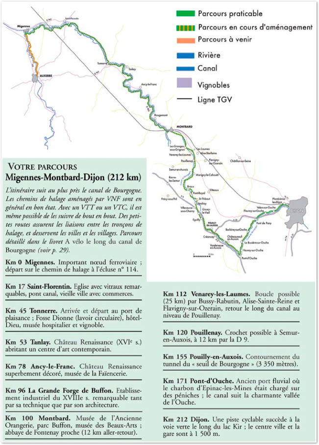 Der Canal de Bourgogne ist ideal für eine Radtour geeignet: Der Weg führt entlang des Kanals durch schöne Landschaft, rechts und links lassen sich kleine Orte besuchen und es gibt fast immer Übernachtungsmöglichkeiten im „Radfahrerabstand“ - geeignet für jede Leistungsklasse. Die Rückfahrt zum Ausgangsort ist mit dem Zug möglich. Die Qualität der Treidelpfade ist unterschiedlich, es wird jedoch laufend an der Verbesserung gearbeitet, ideal sind die letzten 40 km vor Dijon, einige Zwischenstücke gerade im mittleren Teil sind für Rennräder nicht geeignet, selbst wir fluchten auf unseren Tourenrädern. Kleine Nebenstraßen verbinden die Teilstücke und ermöglichen die Zufahrt zu den abseits liegenden Städten und Dörfern. Eine ausführliche Streckenbeschreibung findet sich auf der französischen Internetseite „Le canal de Bourgogne“ (siehe auch die Übersichtskarte am Ende dieser Seite, leider ist inzwischen - 2015 - diese durch eine unübersichtlichere Karte ersetzt worden).
