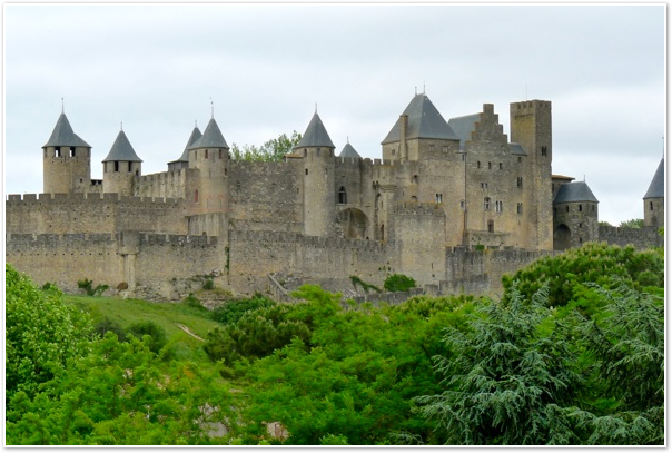 Unser Hotel „Les trois couronnes“ legt direkt am Aude mit herrlichem Blick auf die Festung von Carcassone. Nach Duschen und Umziehen steht die Besichtigung der Festung an, leider bei Kälte und leichtem Niesel-regen. Die Festung ist schon beeindruckend, insbeson-dere auch die herausragenden Kirchenfenster der Basilika St. Nazaire. Gott sei Dank wurde diese verfallende Festung in der Romantik des 19. Jahr-hunderts vor dem endgültigen Zerfall und der Schleifung gerettet.