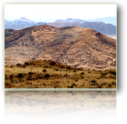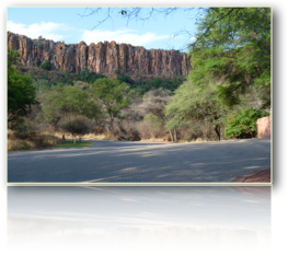 einer ehemaligen Polizeistation. Die weitläufige, sehr gepflegte Anlage zieht sich sanft den Berg hinauf. Ebenso erscheinen unsere Häuschen und etwas unterhalb derselben lädt ein grosser Swimmingpool zum Baden ein. Das Wasser ist herrlich erfrischend. Wir verweilen noch ein wenig und am späteren Nachmittag starten wir direkt von den Bungalows aus zu einer Miniwanderung (Route ☛) auf dem anfangs rotsandigen und dann immer steinigeren Weg zur abrupt senkrechten roten Felswand Die Bewunderung ist groß: Wie ein abstraktes Bild erscheint der rotgrundige Fels mit grünen, auch bläulichen und weissen Einlagerungen (teils Flechten). Das Ganze eingetaucht ins warme Abendlicht. Nach einer Kehrtwende um 180 Grad erschließt sich unter uns die üppige Savanne; darüber schweift der Blick unendlich weit. Das afrikanische Licht kann einen wirklich verzaubern! Als