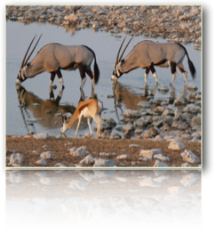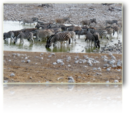 Bei leichter Gewitterstimmung checken wir um 9.30 h aus und bewegen uns 110 km auf der Schotterpiste fort. Sehenswert auf dieser Strecke ist der etwas abseits liegende versteinerte Wald, der petrified forest. Um 11 Uhr ist dort keine Menschenseele zu sehen. Trotzdem parken wir und kaum sind wir ausgestiegen, kommt ein schwarzer Junge aus dem Busch gesprungen und führt uns auf leicht ansteigendem Gelände zu den versteinerten, stark zerbrochenen Baumstämmen, Millionen von Jahren alt. Zurück am Eingang hat in der Zwischenzeit eine wunderbare Vermehrung der farbigen Bevölkerung stattgefunden. Alle wollen etwas verkaufen. So erwerben wir einigen, nicht wirklich nötigen Steinkram. Dann gehts schnurgerade weiter in Richtung Outjo. Gerrit fährt schon so routiniert Schotter- und Hügelpisten, daß ihm nun die geteerte Strasse langweilig vorkommt. Kurze Pause unter Bäumen und neben Termitenhügeln. In Outjo ist wieder tanken fällig. Danach essen wir beim deutschen Bäcker normal zu Mittag,obwohl auch er für seine Schwarzwälder Kirsch- und andere Torten bekannt ist. Auffallend im Städtchen sind Horden von Schülern aller Altersklassen in Schuluniform. Und wieder fahren wir weiter in Richtung Etosha-Pfanne. Ankunft dort am Eingangstor von Okaukuejo um 16 h. Es ist unwahrscheinlich heiß, man schnappt fast nach Luft. Die weitläufige Anlage - Renovierung im vergangenen Jahr - ist sehr gepflegt und einladend und die kralartigen Bungalows sind vom Feinsten. Was uns besonders freut, ist die Tatsache, daß sie nur wenige Meter vom Wasserloch entfernt liegen. Und schon können wir Giraffen, Nashörner, haufenweise Zebras, Gnus, Kudus, Oryxe, Schakale und jede Menge Vögel beobachten. Tiere ohne Ende! Ein ständiges Kommen und Gehen, aber ganz diszipliniert und kein Gedrängel am Wasserloch. Man meint, es läuft ein Film in Zeitlupe ab. Als Zuschauer wird der Mensch selbst ganz ruhig, das hat schon fast etwas meditatives. Wir müssen uns losreissen, denn es wird Zeit zum Abendessen. Auch hier erwartet den Gast Feinstes. Bevor wir in die Himmelbetten sinken, statten wir den Tieren an der Tränke noch einen kleinen Besuch ab.