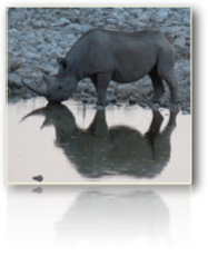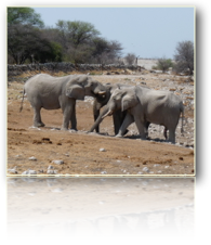 Nach einer erholsamen Nacht im angenehm temperierten Bungalow schleicht Peter um 6 Uhr zur Tiertränke und zwei Stunden später sitzen wir vier mal wieder ausgiebig beim frühstücken. Anschliessend natürlich Tiere beobachten und dann begeben auch die Zweibeiner sich ans Wasser zum Schwimmen und dösen unter den schattigen Baumkronen. Am Frühnachmittag genehmigen wir uns einen kleinen Imbiss mit Obst, Muffins und Kaffee. So gestärkt unternehmen wir mit dem eigenen Vehikel eine Entdeckungstour in die Etosha-Pan. Schon bald erspähen wir Zebraherden, Antilopen, Kudus und Gnus und plötzlich, ganz unverhofft, taucht ganz nah zwischen den Büschen erst ein Elefant auf; kurz darauf gesellen sich noch zwei Dickhäuter dazu. Aus Sicherheitsgründen müssen wir bis spätestens 18 h im Ressort zurück sein. Vor dem Dinner noch ein Abstecher zum nahen Wasserloch: Zwei Nashornbullen stecken ihr Revier ab. Es erwartet uns noch eine andere Überraschung u. zw. erscheint während des Desserts plötzlich der Manager des Hauses, gratuliert auch im Namen von Herrn Biermaier aus Grafing und das Wesslinger Reisebüro vorzeitig der Marlis zum Geburtstag und lädt uns alle vier gleich nach dem Essen zu einer Nachtsafari in die Etoscha Pfanne ein.
