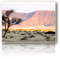 Nach einem langen erholsamen Schlaf frühstücken wir ausgiebig. Abfahrt dann 10 h Richtung Sossusvlei. Gerrit sitzt schon wieder am Steuer und stellt den Toyota auf Allradantrieb um, da nun kurz nach Stadtende die Schotterpiste (Pad) beginnt. Also "gut pad"! Wir fahren südwestlich vom Gamsberg (2400m) über den Spreetshoogle Pass und bekommen die ersten afrikanischen Tiere wie Antilopen,, Oryxe (Springböcke), auch Rinder und vereinzelt Pferde zu Gesicht; ebenso ein gravitätisch dahin schreitendes Straussenpaar. Plötzlich springt mitten aus der Savanne ein Pavianpaar - im Schlepptau die kleinen Äffchen - und überqueren die langsam ansteigende Straße. Ein auf 1600m Höhe gelegener Picknickplatz lädt zur Rast ein und wir geniessen den weiten Blick in die tief liegende Landschaft. Aber jetzt wird es heftig. Die ständig schmaler werdende Schotterstrecke führt bei 24 % Gefälle in engen, nicht befestigten Haarnadelkurven bergabwärts. Doch für Gerrit scheint es eine der leichtesten Übungen zu sein. Er beherrscht den Wagen schon meisterhaft. Wieder in flachem Gelände staubt es nur noch, Schotter, Staub und flirrende Hitze. Inzwischen sind wir in Solitair beim vielgerühmten Apfelkuchen angekommen und auch unser braver, sparsamer Hochsitzer darf volltanken. Ankunft dann um 16 h im Desert Camp, in Sesriem, bestehend aus knapp 20 Zelthäusern. Sehen von weitem nicht sehr einladend aus. Innen aber, welch angenehme Überraschung großzügiger Safarilook vom feinsten. Ein Riesenbad, sehr geschmackvoll, ein großes bequemes Bett und vor dem Zelt eine kleine praktische Kitchenette. Um 19 h brutzeln die an der Rezeption bestellten Lamm- und Kudukoteletts auf dem eigenen Grill nebst Gemüse und Salat. Beim Schmausen wandert der Blick in die Wüste und auf das Wasserloch, die Berge weit im Hintergrund. Rasch wird es Nacht, aber ausser einem kleinen neugierigen Schabrackenschakal, sicher vom Fleischduft angezogen, lässt sich kein Tier blicken. Nach dem letzten Glas Rotwein sinken wir in die Betten Des Nächtens dann,so gegen 1 Uhr, plötzlich ein Riesenspektakel vor unserer sonst absolut stillen Zeltbehausung. Vermutlich schiebt und zerrt ein Schakal an der Abfalltonne; der Deckel fällt herunter und die leeren Flaschen scheppern gewaltig. Nächste Nacht dasselbe Spiel. Da wir nun den Grund kennen, schlafen wir schnell wieder ein.