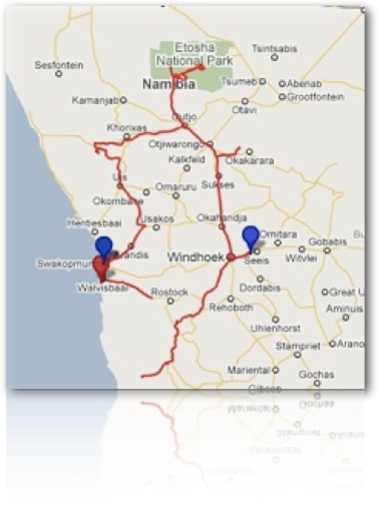 Und hier noch einmal die Reiseroute im Überblick, aufgezeichnet mit einem GPS-Gerät, wobei leider zwischen Solitäre und Walvis Bay sowie bei der Wüstentour in der Walvis Bay auf einem Teil die Batterie versagte! Die Gesamtroute kann im Inter-net bei everytrail betrachtet werden (Route ☛) . Gefahren wurden insgesamt ca. 2.800 km. Fotografiert wurde auf Teufel komm raus, die Fotos finden sich unter flickr. (Falls kein Zugriff möglich ist, schreibt eine e-mail an peter.ehrensperger@gmx.de) . Die namibia-reisebeschreibung2.pdf kann auch als pdf-Datei herunter geladen werden, auch dort sind einige Links auf entsprechende Internetseiten enthalten.