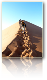 Heute am Montag, den 20. Oktober (Route ☛) ist Sossusvlei im Namib-Naukluft-Park angesagt. Das heisst um 5 h aufstehen, 5.30 h Frühstück auf der noch sehr, sehr kühlen Terrasse. Es entschädigt uns ein traumhafter Sonnenaufgang in der Wüste Start mit dem eigenen Vehikel gegen 6 h, denn um 6,30 öffnet das Tor zum Nationalpark. 60 km Fahrt auf reinem Asphalt (ist man gar nicht mehr gewöhnt) durch Buschsavanne umrahmt von Bergen und den blass lila erscheinenden Dünen. Die Tierwelt präsentiert uns Antilopen, Oryxe, Strausse und immer häufiger entdecken wir in den Bäumen grosse, bizarre Nester des Webervogels. Allmählich gewinnen die Dünen an Größe, sehen aus wie Gebirgsketten und werfen in der noch nieder stehenden Sonne scharfe plastische Schatten. Man kann sich kaum satt sehen. Vor der Düne 45 stoppen wir hinter einigen anderen Frühaufstehern. Gerrit und Thea wagen den Aufstieg direkt am Grat entlang und ich schnaufe ob des rutschenden Sandes gewaltig. Auf beinahe 300m Höhe lohnt eine grandiose Aussicht. Der Abstieg gestaltet sich leicht, man gleitet ganz locker dünenabwärts. Dann Weiterfahrt bis kurz vor Sossusvlei. Dort steigen wir für die letzten 8 km in offene Jeeps um und werden von Einheimischen über unberechenbare Sandschwellen befördert,