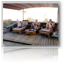 Ganzkörpermassage inclusive! Von hier aus dann per pedes nach Deadvlei. Wieder Gestapfe durch Sand und über plattes Felsgestein, jetzt aber leicht ansteigend. Kurz nach 10 h zurück zum Jeep. Unsere Männer fotografieren und filmen wie die Weltmeister. Gegen Mittag sitzt Gerrit, „our best driver“ wieder hinter dem Steuer. Peter gibt den Copiloten mit GPS und Fotoapparat. Wir Frauen haben es gut, wir können nach Herzenslust schauen und brauchen nur für Wassernachschub sorgen. Bei den hohen Aussentemperaturen und der trockenen Luft hängt man ständig an der Flasche. Beinahe zurück im Desert Camp biegen wir südöstlich ab zum nahe gelegenen Sesriem Canyon. Es ist jetzt knallheiß und deshalb beschliessen wir, erst abends im benachbarten Restaurant zu speisen. Deshalb gibt es - zurück im Camp - eine kleine Brotzeit mit Brot, Wurst, Käse, Cornichons, Bier und Wasser auf unsrer kleinen, jetzt schattigen Terrasse. Anschliessend gut zweistündige Siesta im Luxuszelt. Trotz des nachmittäglichen Wüstenwindes, der sich langsam aber sicher zu einem Orkan entwickelt und die doppelten Zeltbahnen schwingen lässt, ist es gut warm. Das abendliche Buffet im schmeckt uns hervorragend und das zu unwahrscheinlich niedrigen Preisen. Für 680 Nad Doll.- ca. 31 Euro pro Paar incl. 2 Flaschen Weisswein, Bier und Mineralwasser. Danach sind wir so müde, dass zuerst wir Frauen schon vor 22 Uhr uns in Morpheus Armen fallen lassen; die Männer aber den letzten Rotwein nicht verkommen lassen wollen.