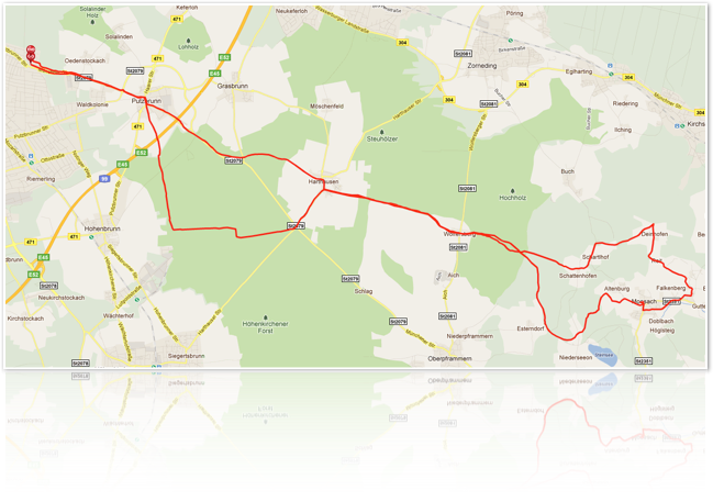 Eine nicht zulange Tour durch Wälder führt über Putzbrunn, Harthausen, Wolfersberg, Scharthof, Deinhofen (Steigung hinauf nach Reit) nach Falkenberg zum Mittagessen. Von dort steil bergab nach Moosach. Von dort gibt es zwei Möglichkeiten. Einmal den „offiziellen“ Weg auf der Teerstrasse zum Steinsee, Esterndorf, Nieder-, Oberpframmern und Putzbrunn zurück nach München. Dieser Weg hat einige unangenehme Steigungen (Steinsee, Esterndorf) und die Strasse ist ab Oberpframmern stark befahren. Kürzer und mit weniger Steigungen ist der hier aufgezeichnete Weg über Altenburg zum Steinsee und Abbiegen kurz vor Esterndorf nach Wolfersberg und zurück nach München. Die Gesamtstrecke beträgt vom Ortsrand München ca. 42 km mit 370 m Aufstieg zwischen 517 und 624 m Höhe. Der Trip findet sich bei everytrail.
