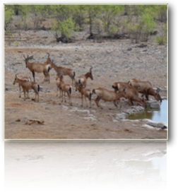 Gut ausgeschlafen trotz des nächtlichen Gewitters erscheinen wir kurz nach 8 h beim Frühstück. Beim Kaffeeausschank, unmittelbar neben mir vernehme ich eine bekannte, weibliche Stimme. Bei näherem Besehen erkennen wir uns; es handelt sich um Sylvia aus München. Wir sehen uns einmal pro Jahr bei einer gemeinsamen Freundin. Die Welt ist doch sehr klein! - Um 9.15 verlassen wir heute schon das Camp, denn die Etappe ist etwas länger. Zurück nochmals durch die Pfanne über Okaukuejo und von dort - wieder auf geteerter Straße - erreichen wir gegen Mittag zum zweiten Mal Outjo. Erst Benzintanken und dann Dollares. Peter verschwindet beim deutschen Bäcker, um sich die Schwarzwälder Kirsch (welche ich später als trocken empfinde) einzuverleiben. Während Gerrit noch mit dem Toyota beschäftigt ist, gehen wir Frauen auf die Jagd nach afrikanischer Kunst. Erstehen auch einige hübsche Mitgebringsel, schlichte steinerne Buchstützen und Salatbestecke aus Horn. Im Anschluss daran Weiterfahrt in Richtung Waterberg. Wir streifen dabei Otjuwarongo, ein sehr schmuckes Farmerstädtchen der Hereros, dessen Straßen von üppig blühenden Flammenbäumen gesäumt sind. Bald darauf erscheint der nächste Ort Okakarara. Auch sehr ansehnlich. Nun beleben auch mehr und mehr Bergrücken das Landschaftsbild ; die Savanne mit unzähligen Termitenhügeln wird dichter und ab und zu stolzieren Strausse vorbei. Nach zwei Stunden Autofahrt biegen wir nordwestlich - nun wieder auf die gewohnte Schotterpiste ab und kommen nach kurzer Zeit im Waterberg-Nationalpark-Ressort an,