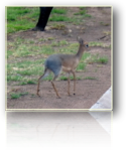 Zugabe bekommen wir beim Abstieg noch einen zarten Regenbogen zu Gesicht. Die Kameras stehen nicht mehr still. Was die Fauna betrifft, soll es in Waterberg viele Affen geben und man schließe deshalb Fenster und Türen gut. Doch kein einziger unserer Vorfahren lässt sich blicken. Dafür ist die Vogelwelt umso vielfältiger und auch das Damara-Dik-Dik, eine kleine Rehart mit blauem Popo lernen wir hier kennen. Am Abend wird auf der hübschen Terrasse gespeist, ausnahmsweise mal a la carte. Essen sehr fein,die Ober ausgesprochen liebenswürdig. Zufrieden oben angekommen beschliessen wir den Abend mit dem „guten roten Rotkäppchensekt“ bei -wie könnte es auch anders sein- letztem Kerzenschein vor unserem Bungalow. Immer lustiger werdend wird es trotzdem nicht zu spät, denn am nächsten Morgen klingelt der Wecker schon vor 6 h. Doch das frühe Aufstehen am