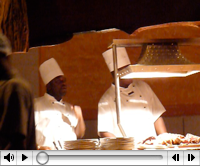 nlage auszuhalten. An der Rezeption werden wir vertröstet, aber mittlerweile herrscht auch hier absoluter Stromausfall; weder EDV noch Telefon funktionieren. So trotten wir zum hiesigen, etwas weiter entfernten Wasserloch. An dieser Tränke tut sich nicht viel. Lediglich die komischen Trappen, kugelrunde große Vögel auf dünnen Beinchen flitzen plötzlich, wie auf Kommando (Familie Trapp lässt grüssen) in die schützende Savanne. Vereinzelt Antilopen und Zebras, na ja, inzwischen sind wir sehr verwöhnt. Zurück im Camp, nach fast vier Stunden, gibt es endlich wieder Strom. Auch das Abendbuffet im Freien ist recht ordentlich. Zum Ausklang des Tages ziehen wir mit der wieder leidlich gekühlten Weissweinflasche auf der Suche nach einem geeigneten Sitzplatz durchs Camp. Diese sind aber alle schon von den zeltenden Besuchern belegt. So landen wir etwas umkommod vor unserer Behausung auf einer niederen Mauer, aber mit Kerzenlicht. Dem guten Zug unserer Männer sei Dank, so ist die Flasche bald geleert und vor 22 Uhr liegen wir wie gehabt im bequemen Himmelbett. Mücken gibt es kaum, doch während der Regenzeit hat der Moskitoschleier sicher seine Berechtigung.